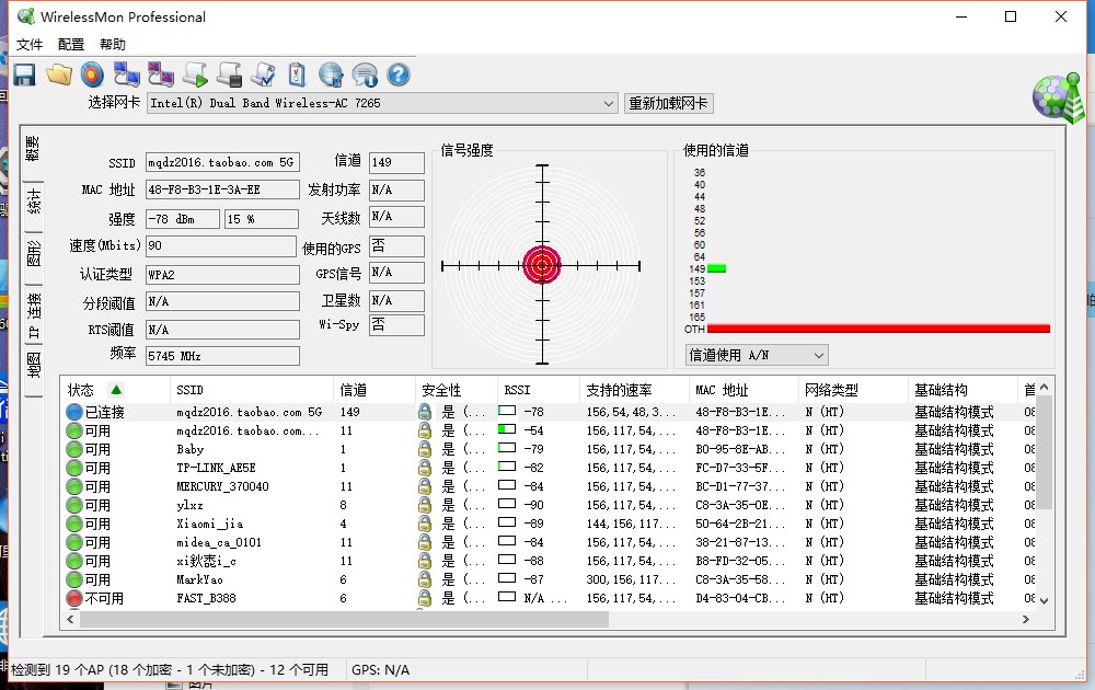 WirelessMon是一款无线信号测试软件,能列出周边所有的无线路由器、无线AP或基站的信号强度、信道等实时信息,测量显示出来的无线信息和数值,是调整信道避免同频干扰的重要依据,是一款无线覆盖工程必备的工具软件。