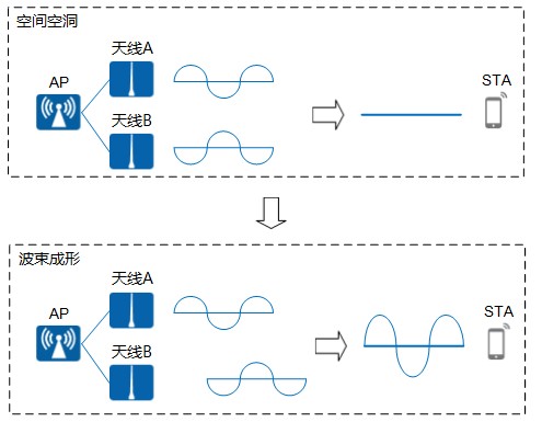 多天线系统中,如果不同天线传输的信号在传输到达某一位置时存在两条衰减相等的波束,且两条波束相位相反,就可能会出现空间空洞。802.11n标准提供的波束成形技术,可以通过预先补偿发射天线的相位,让两条波束进行叠加以实现最好的效果。