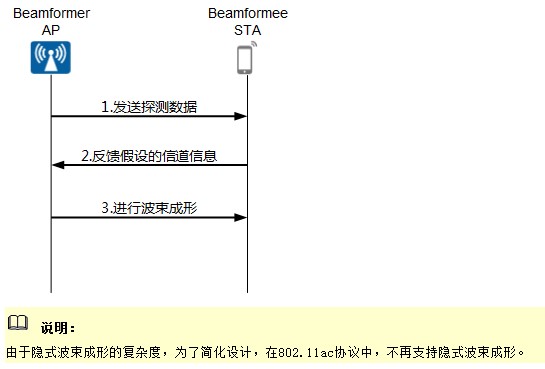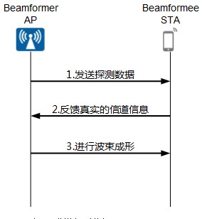 隐式波束成形最初的设想是不需要STA来反馈信道信息的,其采用的方式是利用时分双工TDD(Time Division Duplexing)系统的互易性(即认为同频段的上下行的信道状态信息是相等的),将上行信道信息直接应用于下行,进行波束成形。 在802.11n协议中,隐式波束成形信道信息的探测和反馈流程如下: