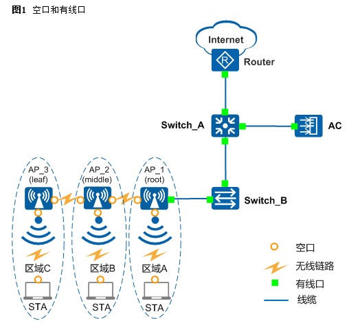 空口是看不见摸不着的,空口之间建立的链路称为无线链路,STA和AP之间可以通过无线链路互通,AP和AP之间可以通过无线链路建立无线网桥。和空口相对应的是有线口,有线口固定在设备上,通常指光接口和电接口。