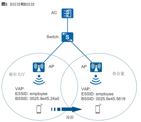 例如一个公司里覆盖了无线网络,员工用手机搜索到名称为employee的无线网络接入并能公司内漫游。如图1所示,在前台大厅里面手机搜索到的employee就是ESSID,也就是通常习惯称呼的SSID。随着员工在公司里移动,手机漫游到不同的AP覆盖范围内,ESSID始终是不变的,但是BSSID随着手机接入到不同AP下而不断变化,因为不同AP上的VAP数据链路层MAC地址都不相同。