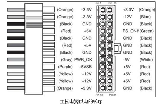 具体来说,黄色代表+12V电源线,红色代表+5V电源线,橙色代表+3.3V电源线,灰色代表P.G信号线,蓝色代表-12V电源线,紫色代表+5V StandBy电源线,白色代表-5V电源线,绿色代表PS-ON信号线,黑色代表地线。