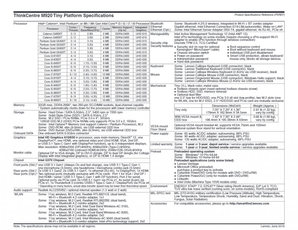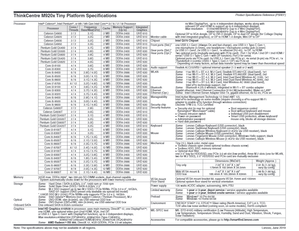 联想Lenovo ThinkCentre M920x 与 M920q 的详细规格表