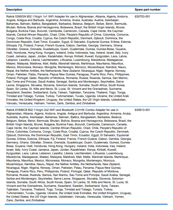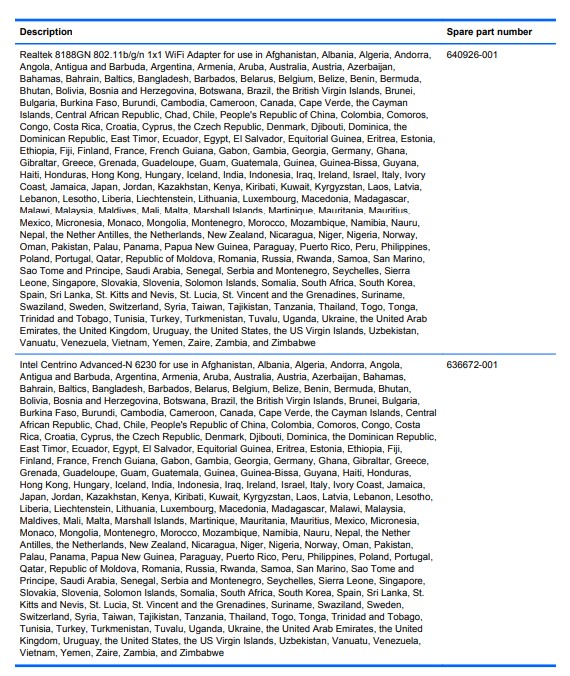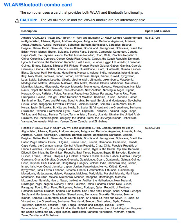 HP ProBook 4230s商用笔记本内置适用无线蓝牙模块列表