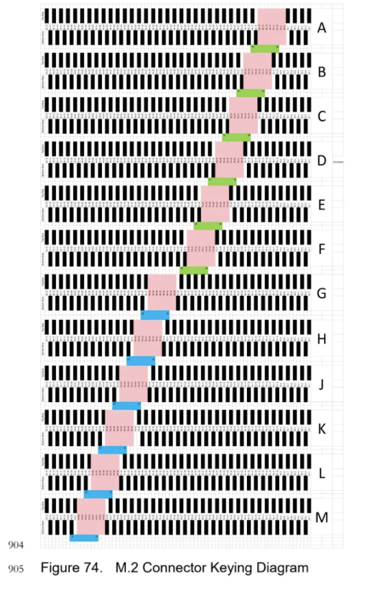 B-key情况适用于sata协议传输,M-key情况适用于Pci-e传输(最多4个pcie通道),E-key 用于网卡(最多两个pcie通道加一个usb通道),B+M可以用于pcie(最多两个pcie通道) 也可sata(一个sata通道)[2][详见Electrical Specification]